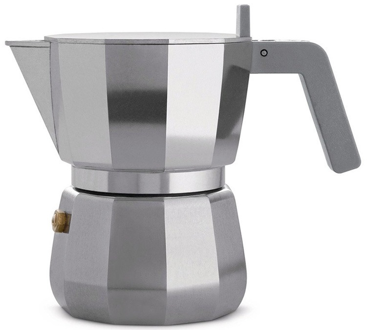 Designed by British architect Sir David Chipperfield for Alessi, this Moka pot is a superb coffee maker with a unique design. With a flat lid that doubles up as a cup warmer, a high-quality aluminium body and a polyamide handle, this coffee maker is durable and produce an amazing cup of coffee. This moka pot has a 150ml (3 espresso cups) capacity and is compatible with all heat sources except induction stoves.